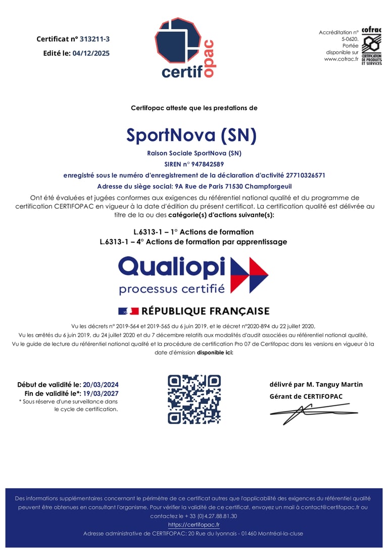SPORTNOVA est un organisme de formation certifié qualiopi